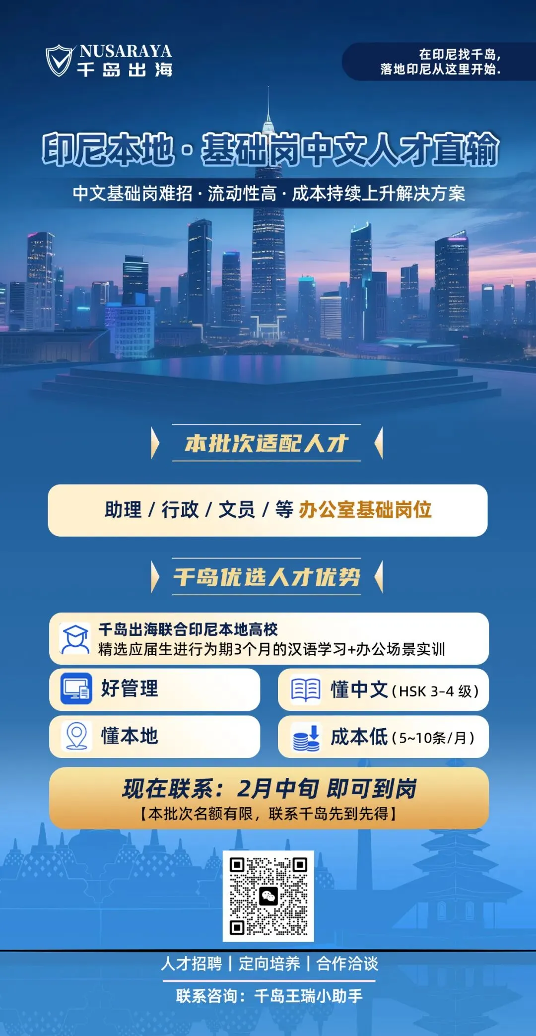 企业用工成本一路攀升!别急,针对这一行业痛点,千岛出海重磅推出解决方案 —— 印尼本地基础岗中文人才批量定向直输服务,帮你轻松破解招人难题!