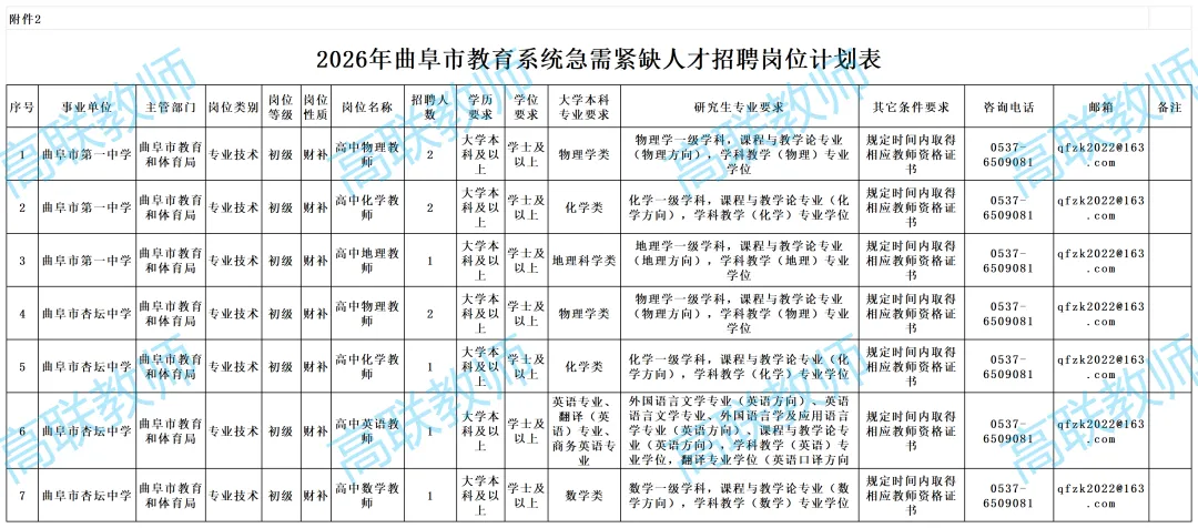 详见《2026年曲阜市教育系统急需紧缺人才招聘岗位计划表》(附件2)。