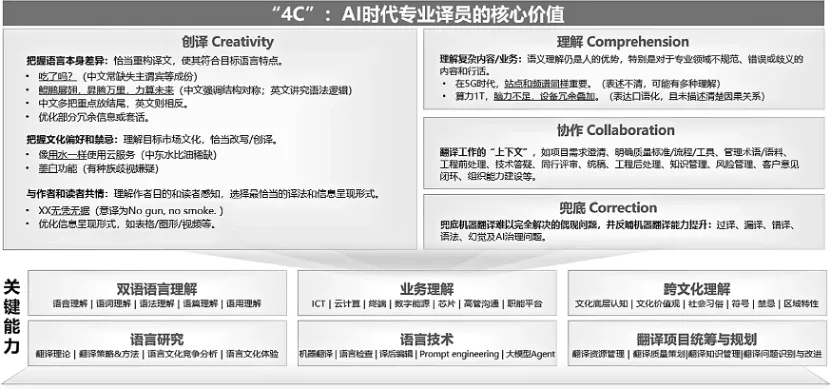 第一个核心方向依然是人工翻译。如图1所示,我们认为,在AI时代,专业译员的核心价值可初步识别为4C(comprehension、creativity、collaboration、correction),即“理解、创译、协作、兜底”。