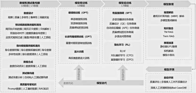 第二个核心方向是机器翻译等语言技术。工欲善其事,必先利其器。图2展示了机器翻译训练的大致流程。目前机器翻译仍有很大的提升空间,除了通过思维链(chain of thinking,CoT)、强化学习(reinforcement learning,RL)、检索增强生成(retrieval-augmented generation,RAG)等技术手段改进外,还需要依赖语言专家的知识、数据和经验。图2中涉及“数据”“知识”和“人工”的环节,都是语言类人才可以发挥价值的地方。