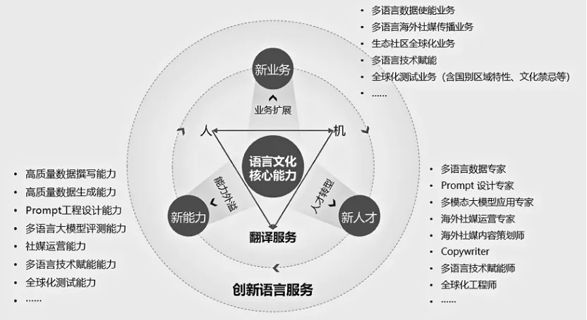 第三个核心方向是创新语言服务。让我们看看世界可能关小了什么门,可能打开了什么窗。如图3所示,内圈为“人工翻译+机器翻译服务核心圈”,是长期积累下来的人才、技术和能力。外圈为“语言服务创新圈”,构筑新业务、新能力和新人才。