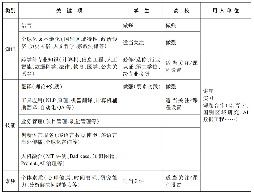表1简单列出了我们认为与语言服务相关的一些关键知识、技能和素质,以及粗浅建议,学生、高校和用人单位可以形成一定的合力。