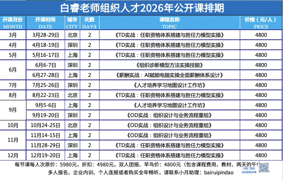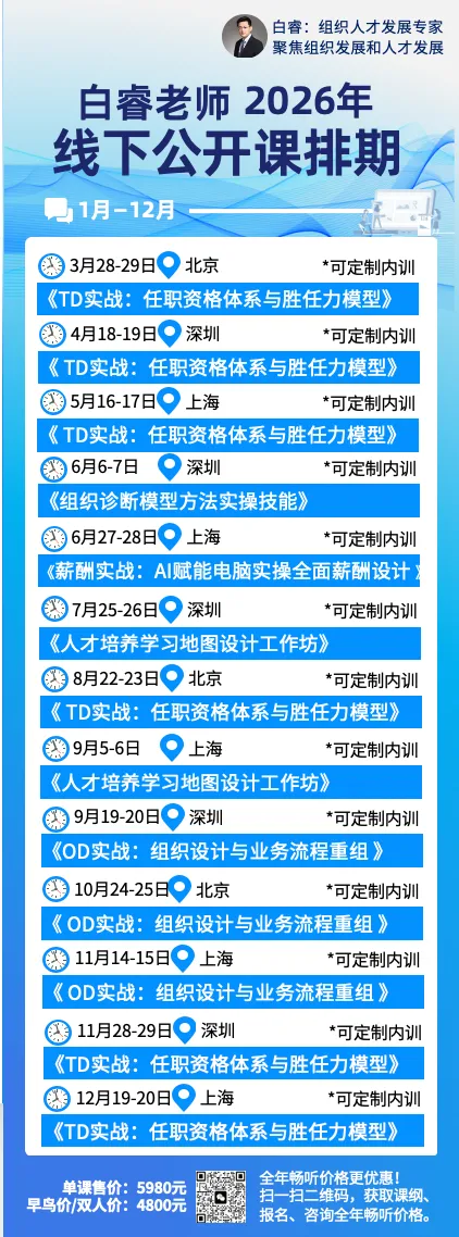白睿老师在2025年开展全面的OD&TD公开课程培训服务,全国各地的HRDer、HRer、TDer、Oder和BPer们参加了《组织设计与业务流程再造》《电脑实操的全面薪酬体系设计》《组织诊断模型方法和过程实践》《电脑实操的全面薪酬体系设计》《任职资格体系搭建和岗位胜任力》《人才培养的学习地图》这五门课。在这里也非常感谢优秀的小伙伴们在学习的道路上与白睿老师一起前行,继续成就彼此。