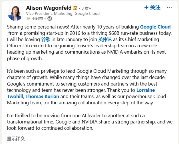 瓦贡菲尔德在社交媒体上公布了这一职业变动。她表示,将于2026年1月底离开效力近十年的谷歌,随后加入英伟达。在谷歌云任职期间,她长期担任营销副总裁,负责该业务线的全球市场营销工作。