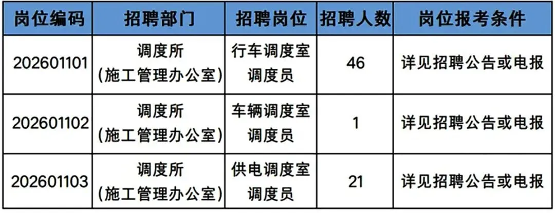 1月14日,集团公司2026年公开招聘调度所(施工管理办公室)调度员工作正式启动,计划招聘68人。