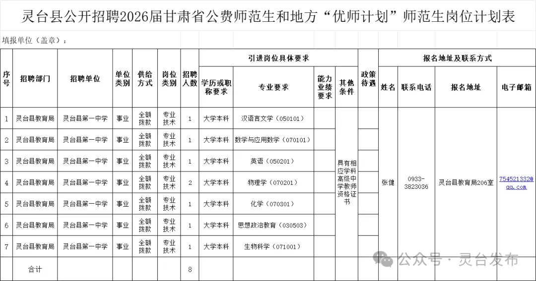 灵台县公开招聘2026届甘肃省公费师范生和地方“优师计划”师范生公告