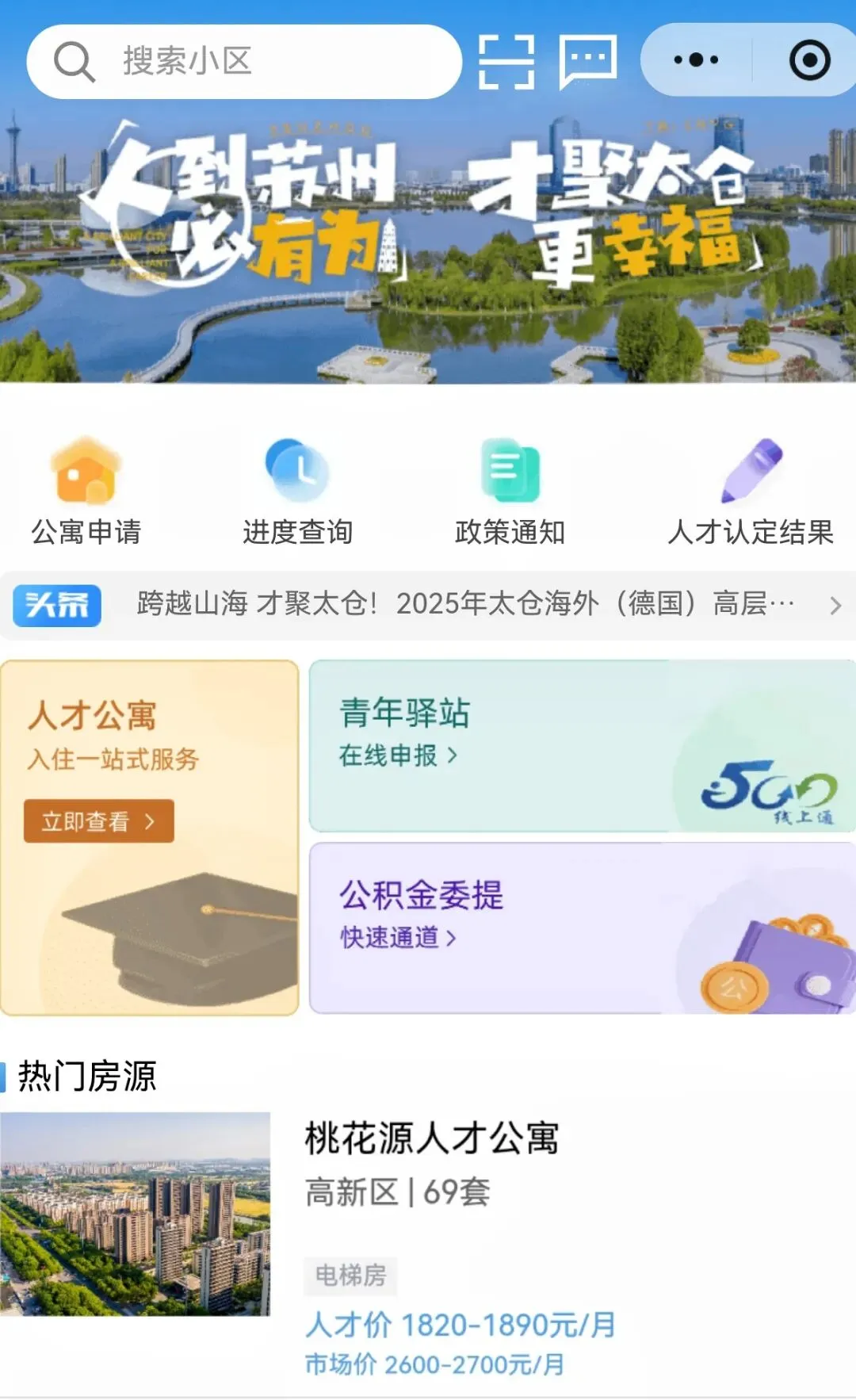 目前,“才到高新就有房”品牌依托“太易居”小程序发布太仓高新区最全、最新的安居政策资讯,提供人才公寓、租房补贴、购房优惠等政策的“一键查询”与“在线申报”服务。此外,小程序还整合了区域内优质的医疗、教育、商业、文体等生活配套资源信息,并可根据用户位置进行智能推荐。