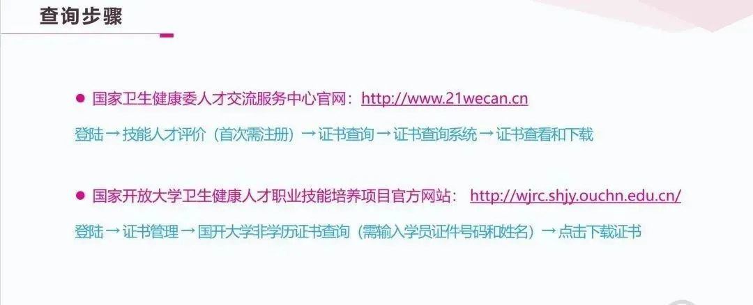 培训项目由国家开放大学和国家卫生健康委人才交流服务中心联合设立并提供线上学习考试平台,考试合格颁发双章职业技能培训证书,可在国家开放大学官网和国家卫生人才网查询,成绩存入职业教育国家学分银行,可实现不同类型成果转换,可作为卫生健康领域用人单位人才评价的参考依据。- 国家开放大学官网:https://www.ouchn.edu.cn/