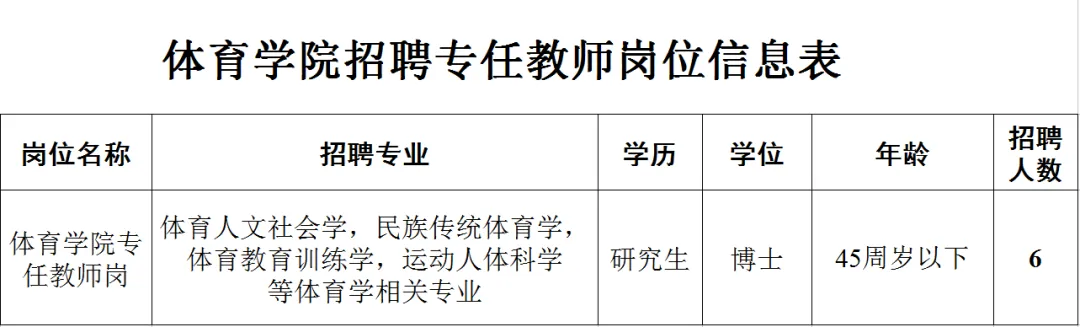 具体招聘岗位及条件见《体育学院招聘专任教师岗位信息表》(附件1)