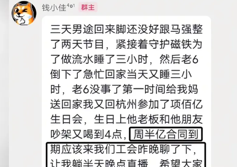 日前,钱小佳曾在直播过程中跟粉丝透露:与女主播周半亿进行了交流,周半亿在跟小酷1995合同到期后加入401。 昨晚,钱小佳开播谈及此事称:我还有一个事情跟你们讲述一下,周半亿那个事情我发了一个开播通知,我昨天晚上不是碰到她了嘛?我跟她聊了一聊,上面这个图又被传出去了,可能传到1995或者传到哪里去了,人家都看到了。又被水友骂了,以为她要跳槽还是干啥的。 你们知道一个点,周半亿她在合同结束之前是不会直播的,就是要等她合同结束之后,才会考虑让他加入我工会直播。至于你们提及的到时候是否会跟1995小酷发生节奏矛盾啥的,这点你们多余了。 1995工会跟她如何处理合同的事情我不参与,跟我之间也没有任何关系,哪怕就是她不来我工会也没有关系,我这边只管她合同结束之后来我工会,到时候我们就一起直播,小酷后面是否起诉她就跟我无关了,毕竟她也没有说合同结束前要直播的,她的合同大概要到今年10月份才到期,这个都是还是很后面的事情了。 红人唯一指定备用小号
