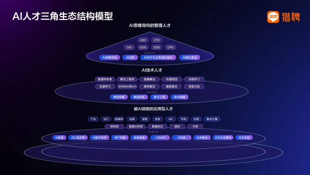 在新时代,社会对“AI人才”的定义被赋予了极其丰富的内涵。猎聘大数据研究院通过对数百万个职位标签及候选人画像的深度挖掘,构建了AI时代的“三角人才结构模型”:即由“AI思维导向的管理人才”“AI技术人才”及“被AI赋能的应用型人才”构成的三层分化体系。