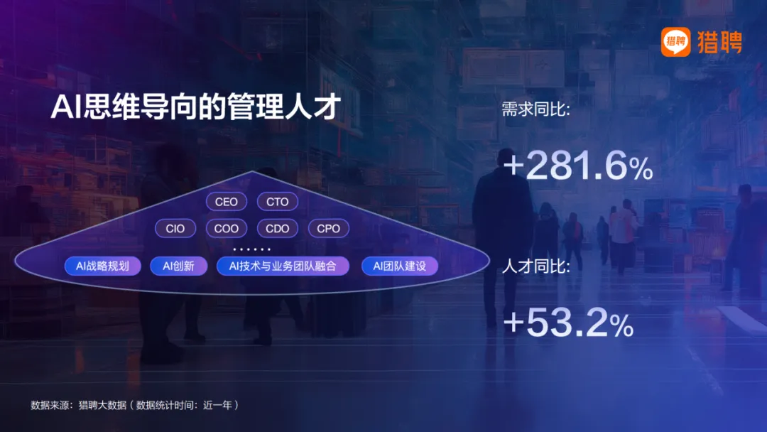 AI思维导向的管理人才这是目前人才市场中最稀缺、需求增速最快的塔尖群体。他们不仅理解AI的技术底层,更具备将算法逻辑转化为商业模式、组织流程及战略决策的综合能力。近一年,AI思维导向的CXO人才需求同比增长高达281.6%,其分布最多的前五行业是计算机软件、电子/半导体/集成电路、互联网、人工智能、新能源。由此可见,具备AI思维的高层领导已成为产业智能化的核心稀缺资源,尤其在科技与实体经济领域集中涌现,标志着行业竞争已进入由AI重塑商业模式与规则的“系统重构”阶段。这不仅意味着AI从工具升级为战略能力,更指向未来竞争的关键:企业能否建立融合技术判断与商业洞察的顶层决策体系。