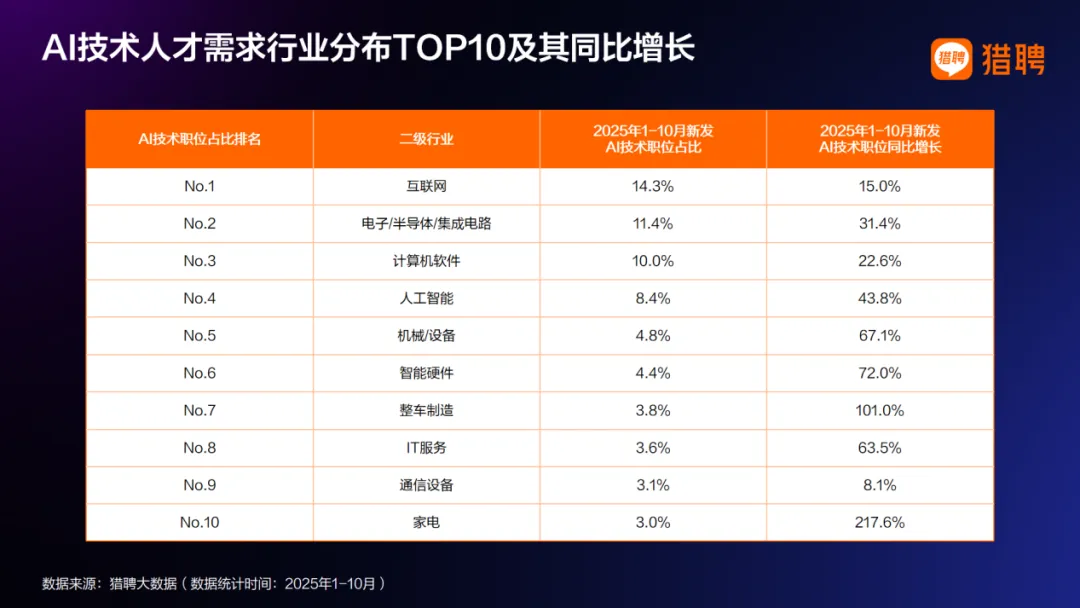 如果说2023-2024年是AI在互联网、软件开发等虚拟空间的试验期,那么2025年则是AI向实体经济全面渗透的“硬着陆”元年。猎聘平台监测到一个颠覆性的关键趋势:AI技术人才需求正以前所未有的速度跨越数字边界,向硬核制造业、汽车业及能源领域加速渗透。