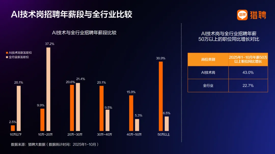 猎聘大数据研究院观察到,2025年AI正从一项前沿的“试验性技术”深度演变为决定职业前景与企业生存的核心驱动力。一个显著的信号是:AI技能已成为高薪“硬通货”。
