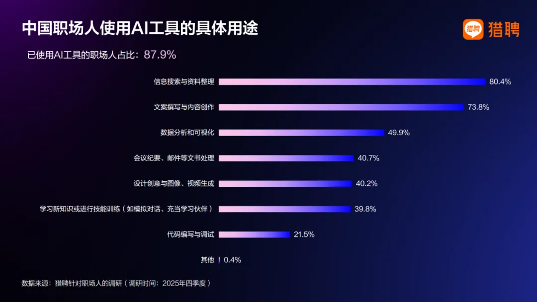 在AI发展的初期,职场人曾普遍经历过一段“技术焦虑期”,担心算法会取代人力。然而,猎聘调查显示,到2025年,主流情绪已从担忧转向拥抱,当前表示已使用AI的职场人高达87.9%。职场人普遍将AI视为个人竞争力的“外挂”与效率的“倍增器”。