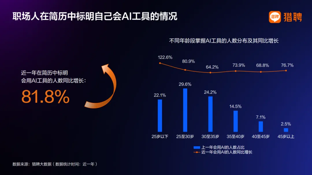 猎聘大数据显示,近一年在简历中标注“掌握 AI 工具”的人数同比暴涨 81.8%,且这场“AI 技能潮”覆盖了所有年龄段 —— 从25岁以下到45岁以上,各群体的AI技能掌握人数增幅全部超过60%。