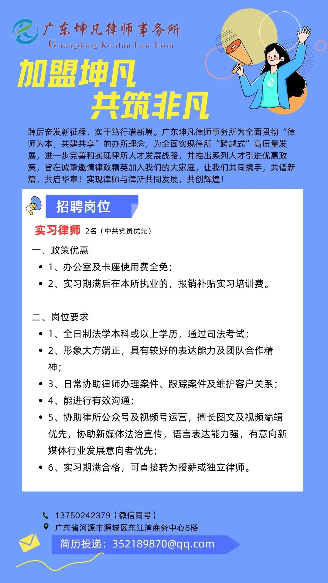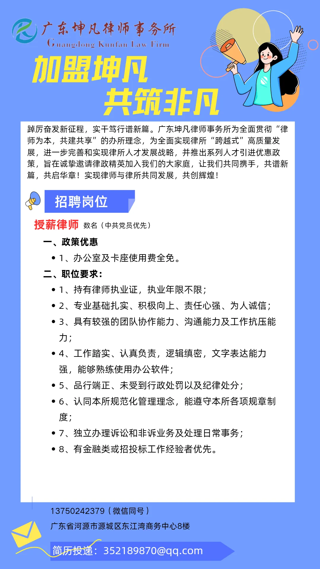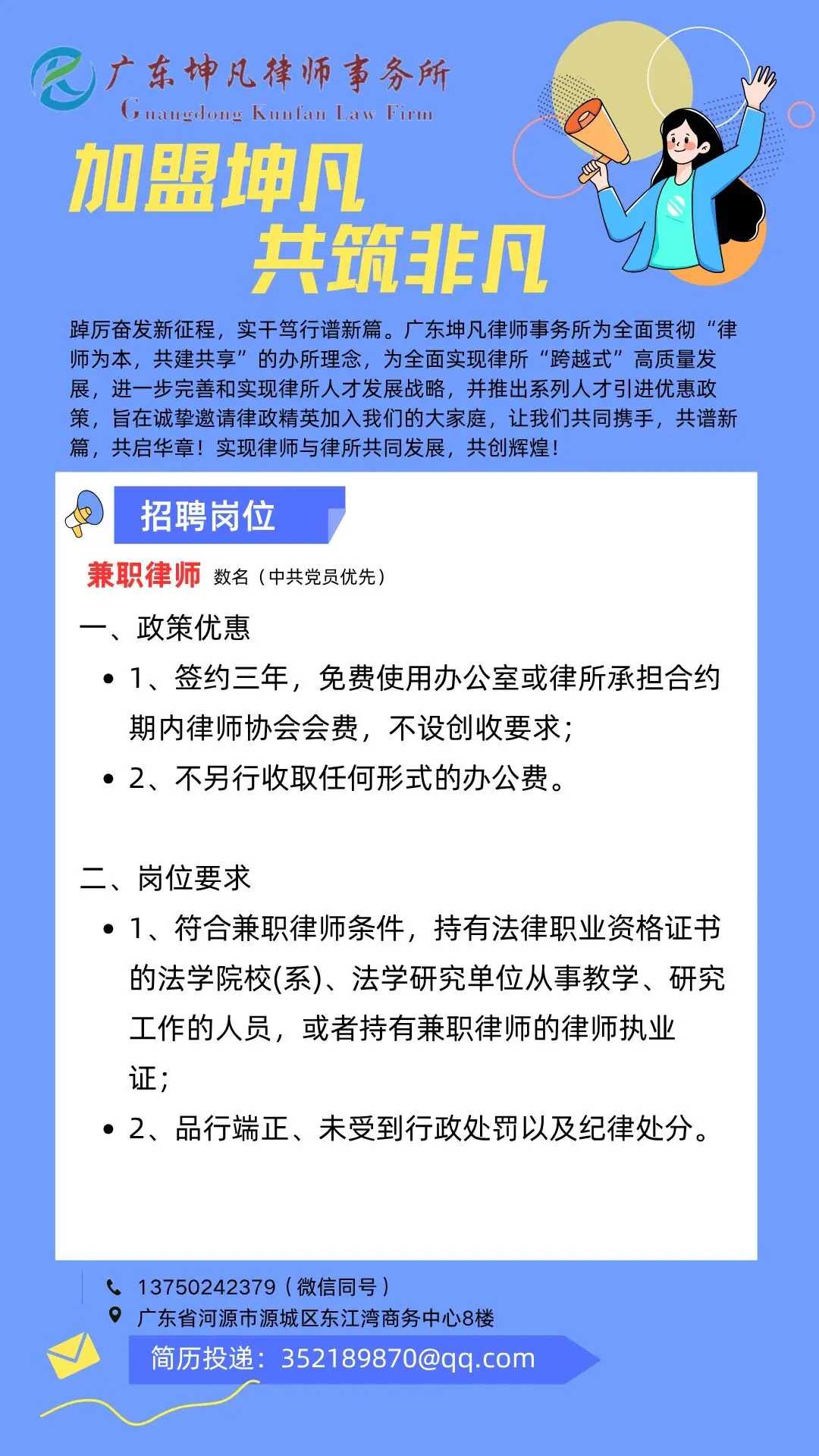 基本情况:广东坤凡律师事务所经广东省司法厅批准设立的,是广东省政府法律服务采购库入库单位,为社会各界提供综合性法律服务的律师事务所,位于广东省河源市源城区永康大道东江湾商务中心八楼,地理位置优越、交通便利,车位充足,律所拥有一流的办公设备、全江景的办公区。团队成员主要由原广东天穗(河源)律师事务所精英骨干组成,团队于2023年获司法部颁发的“全国法律援助先进集体”荣誉称号(国字号荣誉)。律所以完善的行政管理制度、结合科学的公司化管理模式,利用丰富的法律实务经验,争做河源市优秀律师团队的先锋者。广东坤凡律师事务所分设多个专业部门,在秉承专业化法律服务理念的同时,不断开拓新的法律服务范围,在深厚法学理论基础和丰富法律实践的基础上,向规范化、专业化、品牌化持续发展,团队律师代理过标的数亿元的建设工程合同纠纷等影响大的民事纠纷,成功使多起刑事案件嫌疑人或被告人不批准逮捕、不起诉、缓刑或从轻判决。代理过全市目前涉案人数最多的劳动争议案件。承办的多宗案件被司法部门、律师协会或仲裁委员会评为典型案例,进入典型案例汇编。律所多位律师具有涉案企业合规第三方监督评估专家资质,在合规管理方面具有丰富的实务经验。我们的宗旨是全心全意为当事人提供优质高效的法律服务,依法维护当事人合法权益。