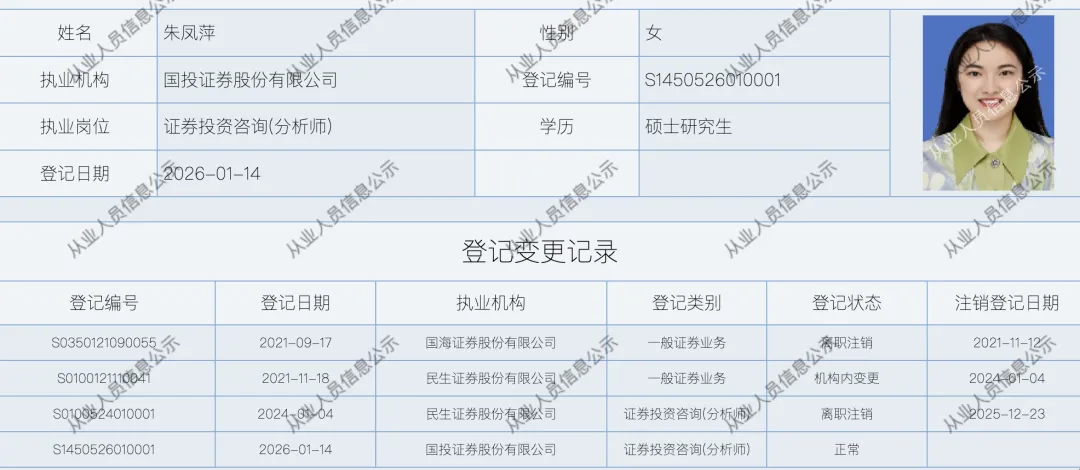 1月15日,证券业协会数据显示,民生证券分析师朱凤萍跳槽国投证券,最新执业日期1月14日。