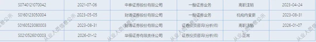 2、马乐怡,1月9日从财通证券离职,1月14日加入华福证券。