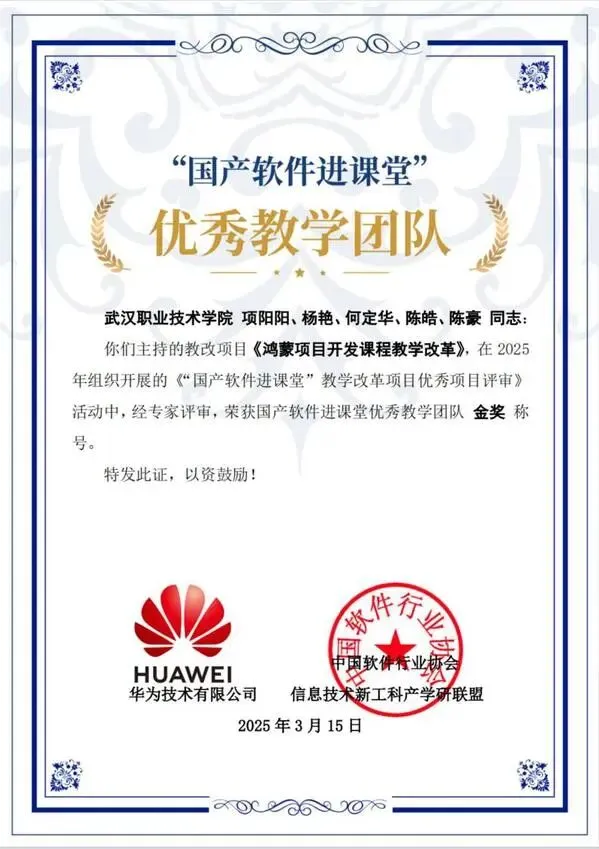 作为湖北省首所公办职业本科学校、国家“双高计划”建设单位,武汉职业技术大学始终坚持以高质量职业教育服务国家战略和区域经济社会发展,紧扣新一代信息技术和数字经济前沿。近年来,学校积极响应信创产业布局,主动融入国产操作系统生态建设,在课程体系、实训平台和师资队伍等方面持续发力。学校建成“鸿蒙工坊”,开设《鸿蒙移动APP项目实训》《鸿蒙项目开发》《鸿蒙分布式开发实训》等特色课程,并与多家头部企业共建“双师型”教学团队,推动教学内容与产业技术同步迭代。2025年,学校鸿蒙教学团队获“国产软件进课堂”优秀教学团队“金奖”称号,“愈见”项目成功入选光谷人才种子基金鸿蒙生态首批项目。
