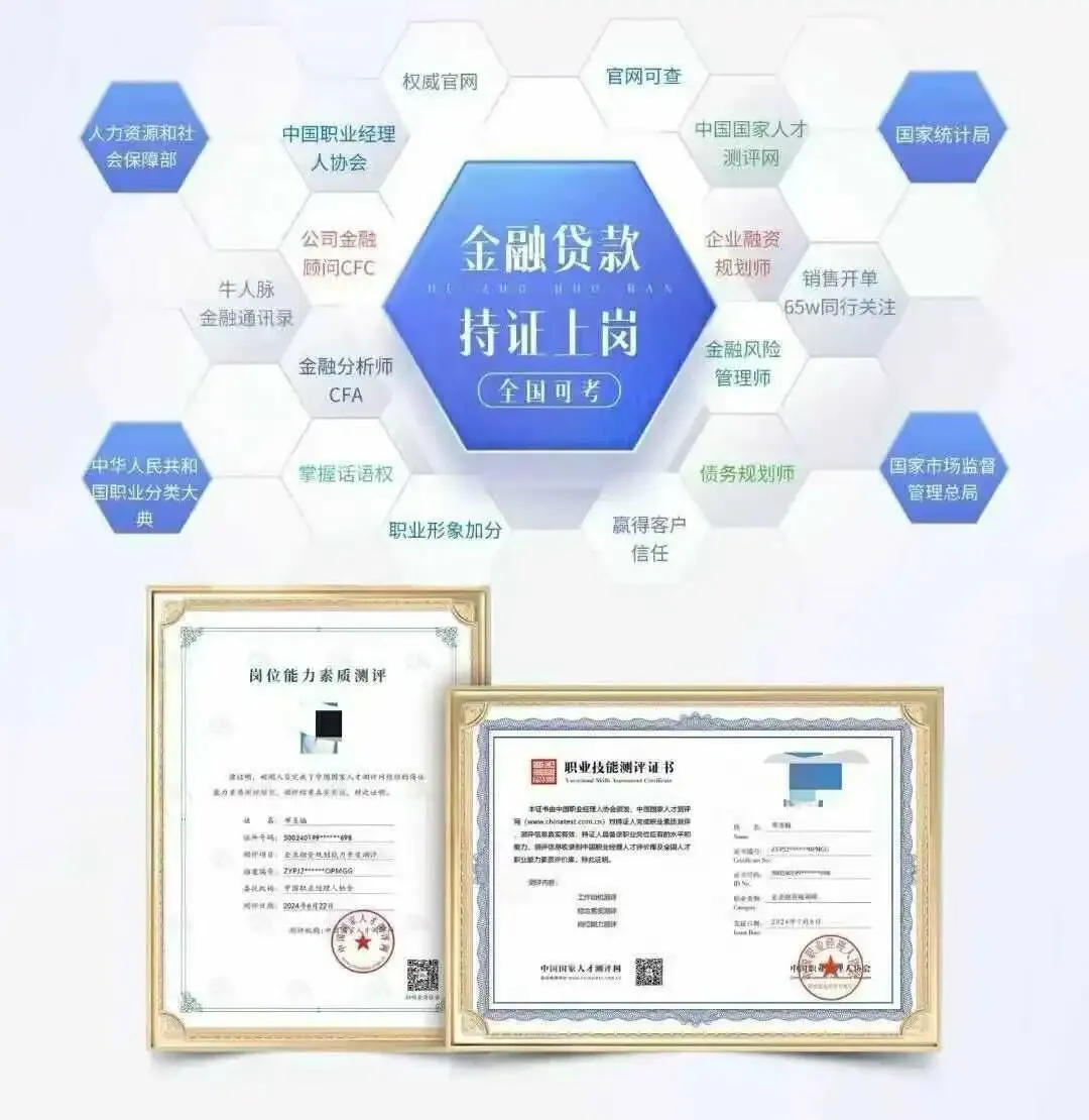🉐双证:一次考试,您将获得一本专业证书+一份测评报告!双权威机构认可,金融助贷行业专用!