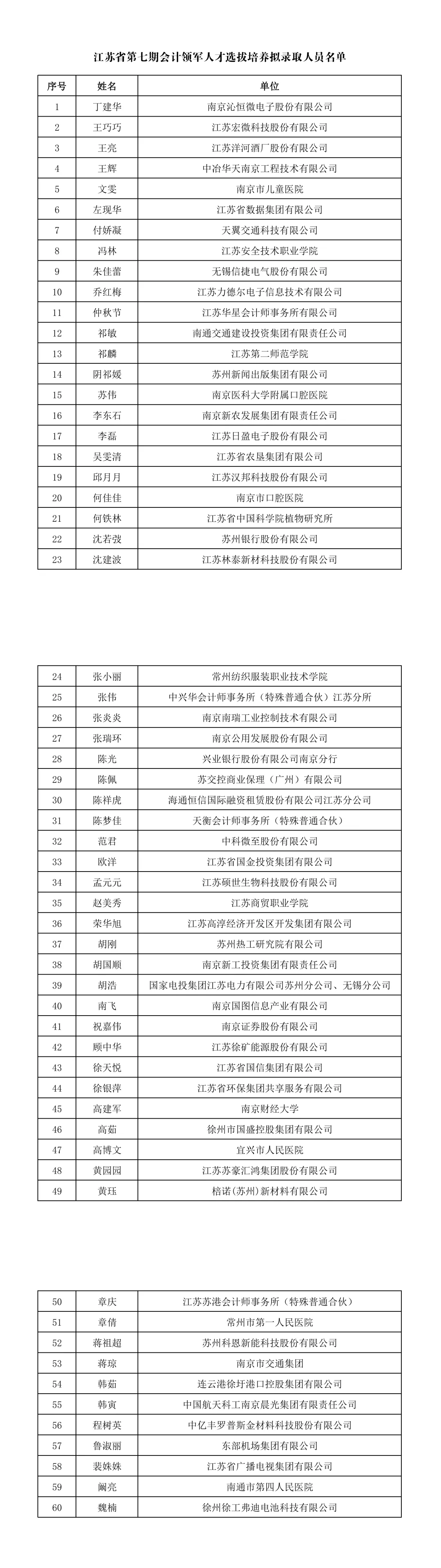 江苏省第七期会计领军人才选拔培养工作经申报、审核及背景资料评分、选拔笔试、选拔面试等环节,拟录取丁建华等60人(详见附件)。现将拟录取人员名单予以公示,公示期为2026年1月14日起5个工作日。如有异议,请以书面形式实名向省财政厅会计处反映。