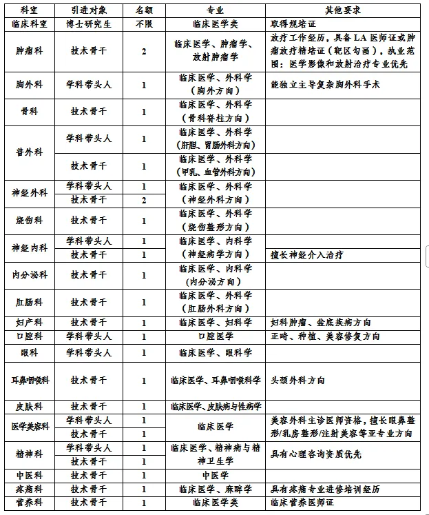 为了加强高层次人才和急需紧缺人才队伍建设,经医院研究决定,面向全社会全职引进学科带头人8名、技术骨干18名及博士研究生数名。本公告长期有效,招满为止,具体如下:
