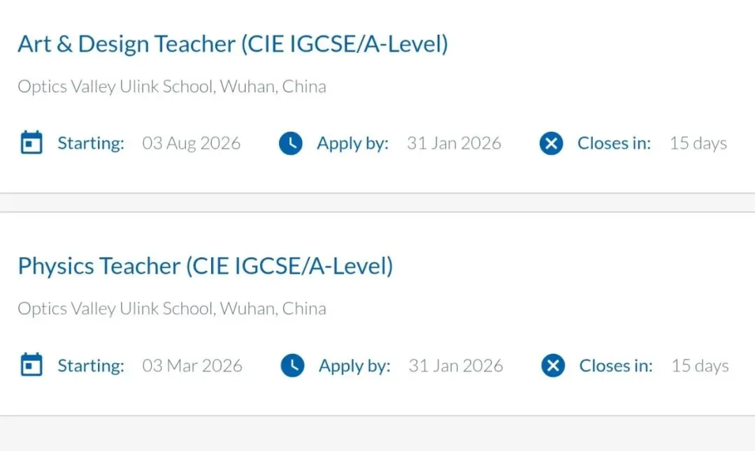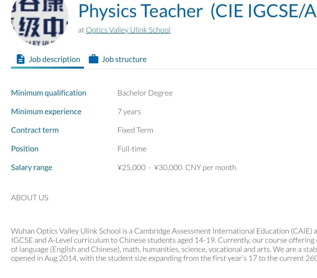 Wuhan Optics Valley Ulink School (Ulink Wuhan) is a stably developing school that was opened in Aug 2014. We are a Cambridge Assessment International Education (CAIE) authorised center that offers IGCSE/A-Level curricula to Chinese students aged 14-19.We are a member of Ulink Education Group, the first school to introduce Cambridge A-Level into China 15 years ago. Up to date, Ulink Education Group has campuses in Guangzhou, Shanghai, Beijing, Suzhou and Wuhan, with more than 3000 graduates, of which, more than 130 were admitted into Oxbridge. We are the only school in China that has been awarded Excellence in Education by CAIE (formerly CIE).Ulink Wuhan is committed to developing professional practices of being student-centered, supporting students in their whole-person development and preparing them for an international life style. For our graduates of Year 2025, over 40% of the students got offers from QS Top 10 universities, over 90% of the students got offers from QS top 100 universities. Over the past 10 years, we have sent hundreds of students to the world's top universities in the UK, Canada, Australia, US, Hongkong and other countries. A short list of the world renowned universities includes University of Oxford, Imperial College, LSE, UCL in the UK, McGill University, University of Toronto and UBC in Canada and Australia National University, Melborne University, University of Sidney in Australia.Wuhan, where our school is located, is centrally situated in China with 4-5 hour high-speed train access to some major cities such as Beijing, Shanghai, Guangzhou and Chengdu. Wuhan itself is a city with both an ancient history and a thriving present with rich cultures, surrounded by beautiful landscapes and abundant places of historic and cultural interest. To name a few: the Three Gorges Dam is the world’s biggest hydro-electric project; Shennongjia Mountain is listed in the UNESCOs program of Man and Biosphere and Wudang Mountain is in the list of World Cultural and Natural Heritages.When you first arrive in Wuhan, we will have a dedicated Admin team to help you settle down and provide continuous support during your stay to make life easier for you. Great attention will be given to teachers’ professional development. All newly joined teachers will be provided with a free Cambridge teacher account to access Cambridge teacher resources. Teachers new to Cambridge will be offered opportunities to participate in online or face-to-face trainings. Experienced Cambridge teachers will be offered opportunities to do extended CAIE trainings. We are a PDQ center of CAIE and able to offer Cambridge’s teacher training and development programs within the school. As a member of Ulink Education group, we also provide our teachers with platform to exchange ideas, experiences and resources with fellow subject teachers in other Ulink schools.Currently we have about 260 students and expect to grow that number to 300 soon. We provide great potentials for career growth. Experienced teachers will be able to take mentor/trainer roles; teachers who want to grow to leadership roles will also be given opportunities to become head of department or senior administration roles.We are looking for professional teachers with a growth mindset, passion in education, hardworking and willing to contribute and make a difference in the whole-person development of teenagers in a multi-cultural school environment.We are looking for an experienced Cambridge A-Level Computer Science teacher to join our dynamic school.The successful applicant will be:• experienced in teaching A-Level Physics and support students' university applicaiton with proven successful learning outcomes;• culturally adaptive and advocating the values of ‘student first’ and “learning and sharing”;• passionate for teaching the subject and educating students in a holistic way;• an experienced practitioner of assessment for learning and active learning• a people-centric team player with excellent organizational skills;• able to differentiate teaching strategies according to students' academic and English foundations;• prior experience in teacher training and mentoring will be a plus.Medical insurance (greater China coverage)Economy flight allowance for one home trip per school year served is provided up to RMB12,000 on a reimbursement basisA housing allowance of RMB3500 per month (before tax) is provided (enough to rent a two-bedroom apartment near the school)Free Chinese lessons for beginning learnersApprox. 10 weeks paid holidays for Christmas, Chinese New Year, and Summer vacation, in addition to Chinese statutory holidays of 13 days, which are all fully paidPD opportunities offered internally and externally by CAIE/AQA/Edexcel我们有以下群组,静待您的到来——