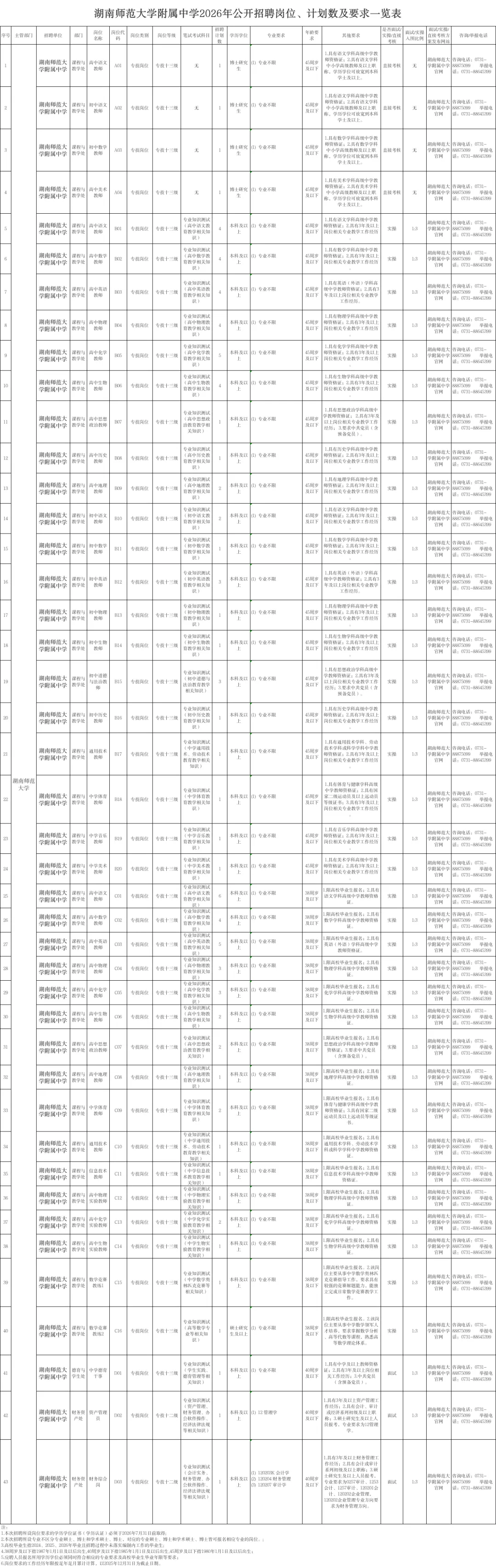 1.湖南师范大学附属中学2026年公开招聘公告岗位、计划及要求一览表