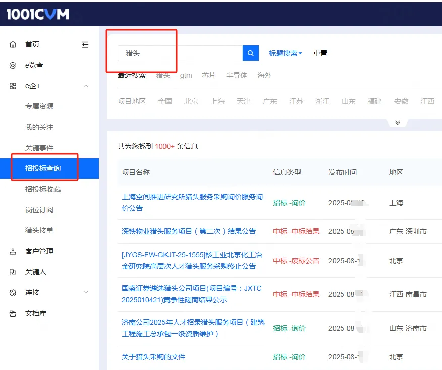 平台项目不够选?自己找!集成海量企业信用信息、猎头公开招投标信息,助你精准锁定目标客户。内置客户管理系统,让你轻松跟进潜在客户,把握每一个商机。自主BD利器,助你突破项目来源瓶颈!