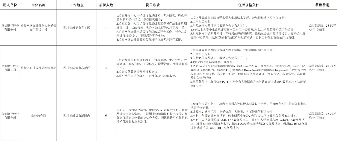 👉成都银行关于2026年招聘总行网络金融部个人电子银行产品设计岗等岗位的公告