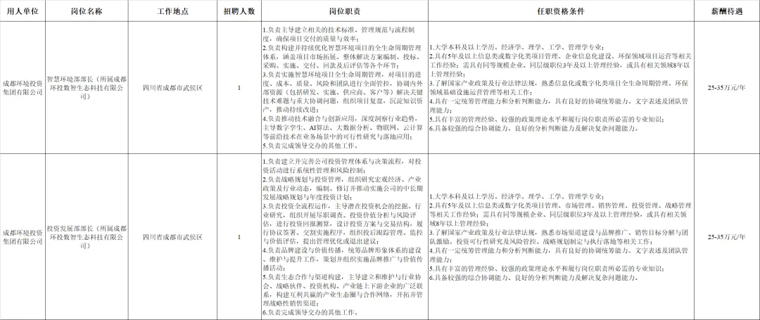 👉成都环境投资集团有限公司下属成都环投数智生态科技有限公司市场化选聘中层管理人员的公告