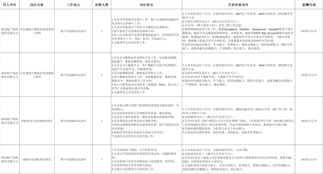 👉锦泰财产保险股份有限公司关于2026年招聘系统工程师等岗位的公告