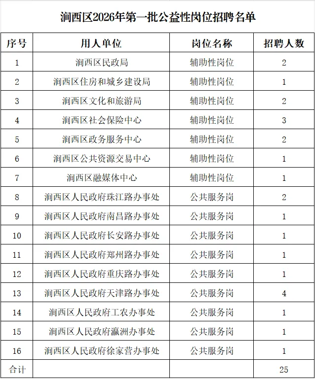 根据洛阳市人力资源和社会保障局 洛阳市财政局关于印发《洛阳市公益性岗位开发管理实施细则的通知》(洛人社﹝2020﹞25号)等有关文件规定,本着“公开、公平、公正”的原则,现面向社会公开招聘公益性岗位人员25名,用于部分区属单位和街道办的工勤辅助类岗位(具体名单见附件)。现将招聘有关事项公告如下: