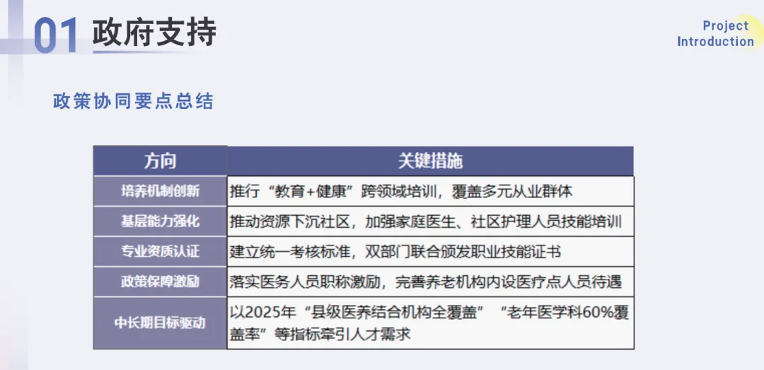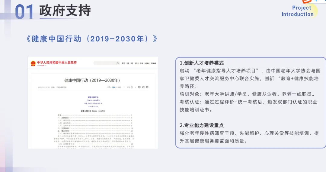为全面贯彻落实《中共中央 国务院关于加强新时代老龄工作的意见》、《健康中国行动(2019-2030年)》和《“十四五”健康老龄化规划》文件要求,加快老年健康服务人才队伍培养,中国老年大学协会和国家卫生健康委人才交流服务中心共同启动老年健康指导人才培养项目,在老龄事业领域创新性开展“教育+健康”技能人才培养模式。以老年人健康服务需求为导向,面向全国老年大学(学校)专兼职讲师和在校学员、校外健康从业者以及养老一线职员开展老年健康指导职业技能培训考核工作,学员考试合格由中国老年大学协会和国家卫生健康委人才交流服务中心共同颁发培训证书。