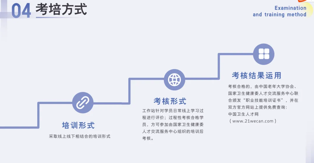 工作站针对学员日常线上学习过程进行评价;过程性考核合格学员,方可参加由国家卫生健康委人才交流服务中心组织的培训后考核。