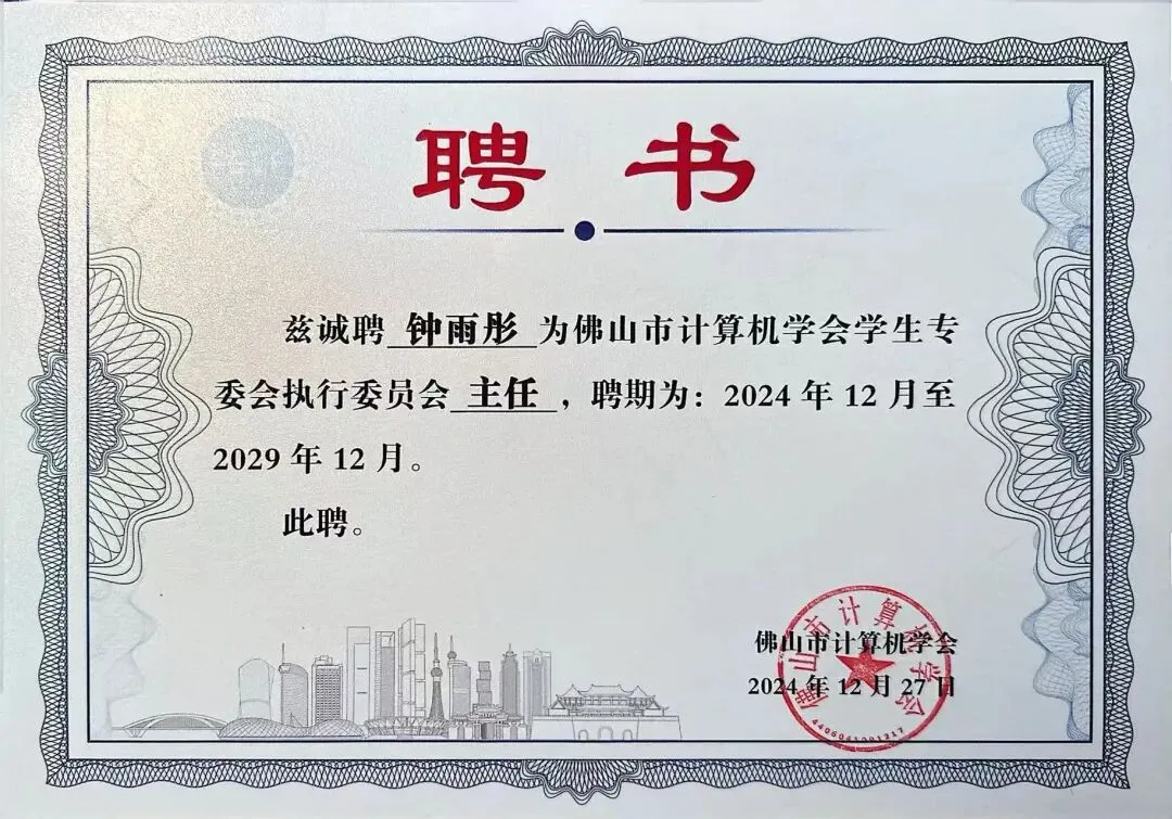 我始终坚信,真正的成长不仅源于扎实的学识,更来自于服务社会的责任感与实践力。在学生工作中,我曾担任学院学生会主席、校团委青年发展部部长、佛山市计算机学会学生专委会主任等职务,策划组织多项校级活动,在服务同学、沟通协调中锤炼自身。凭借持续的努力与担当,我连续两年荣获校级“优秀学生干部”及“优秀共青团干部”称号,并于今年获评“学生干部标兵”。 在社会实践方面,我已累计志愿服务超过220小时,积极参与“三下乡”、寒招等活动,并曾为残特奥会等大型赛会提供志愿服务支持。今年暑假,我作为第一负责人,带领团队赴罗村下柏社区开展“三下乡”实践活动,推动校地共建,获评校级优秀实践团队及个人“优秀队员”称号。这些经历,让我在行动中理解责任,在实践中传递温度。