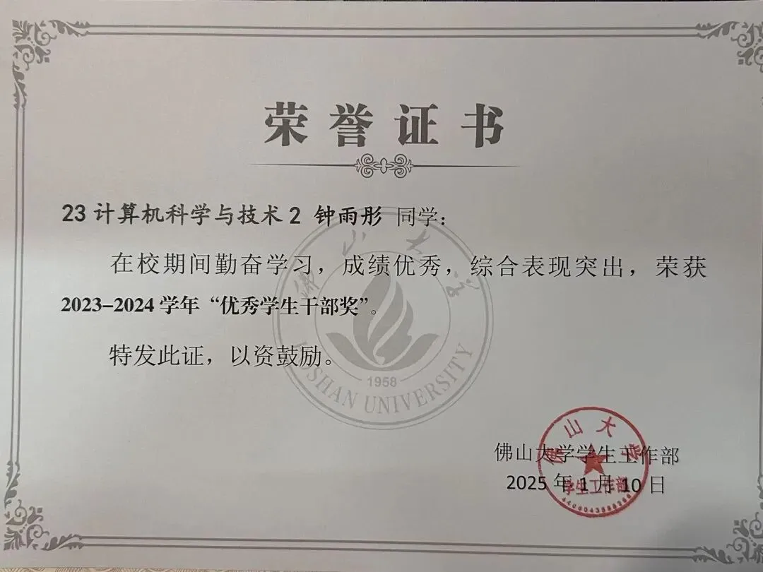 钟雨彤,佛山大学计算机与人工智能学院计算机科学与技术专业2023级本科生,畲族,中共预备党员。