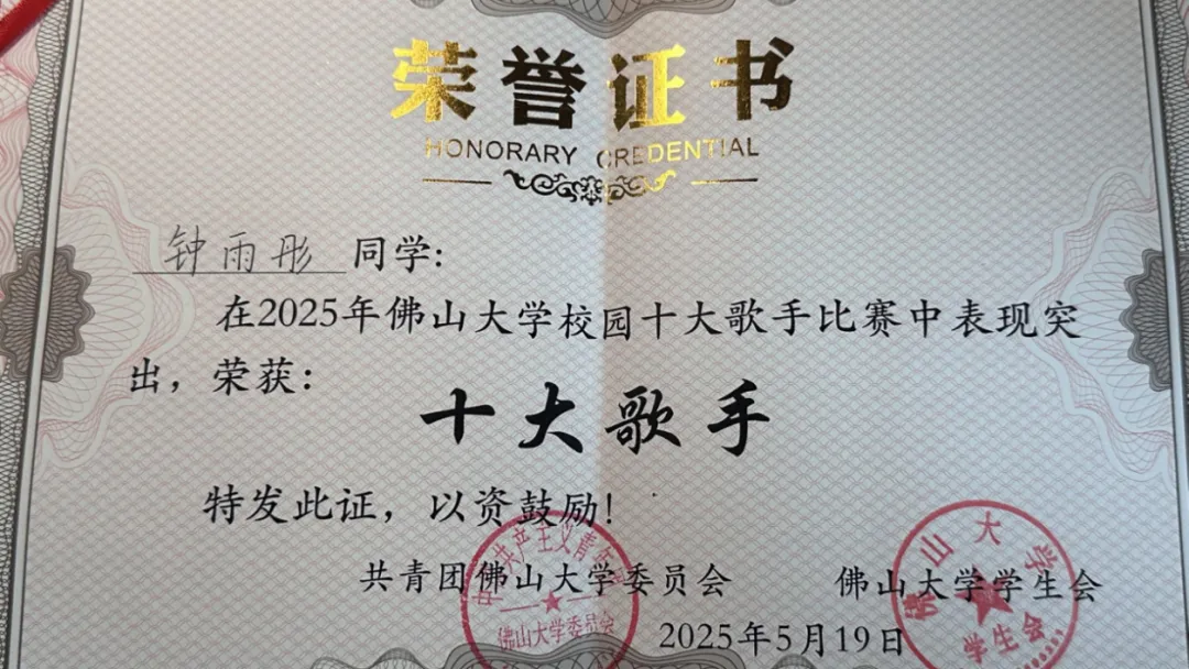 在专注学业与实践之余,我亦努力追寻生活的韵律与色彩,用艺术丰盈生命的维度。自幼习艺,我先后获得声乐十级、中国舞十级、钢琴七级等艺术能力认证,并连续两年荣获校园“十大歌手”称号,让歌声成为传递情感与力量的桥梁。我亦尝试创作,曾改编歌曲参与广东省“立志·修身·博学·报国”主题活动,荣获省级三等奖;在广东省“爱在广东”学校比赛中亦获佳绩。生活之中,我注重营造和谐温暖的集体氛围,个人因此获评“顺德农商行”百星工程奖学金宿舍之星称号,愿以微光点亮身边的美好日常。