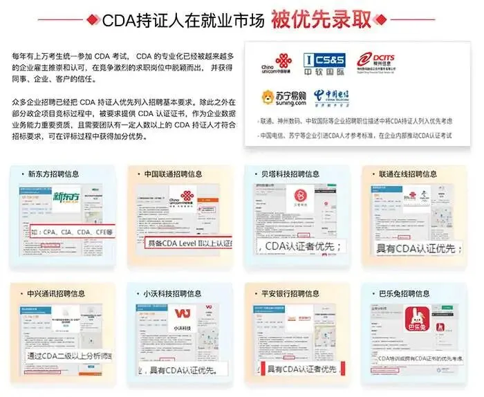 Q: 企业真的认可CDA证书吗?A: 认可度非常高。许多企业在招聘数据分析相关岗位时,都会注明“CDA持证人优先”。尤其是在金融、互联网、零售等行业,比如部分银行的科技岗、四大会计师事务所的分析咨询岗,都会将CDA证书作为一项重要的能力参考。中国联通、德勤、苏宁等企业甚至为考取CDA的员工提供补贴。