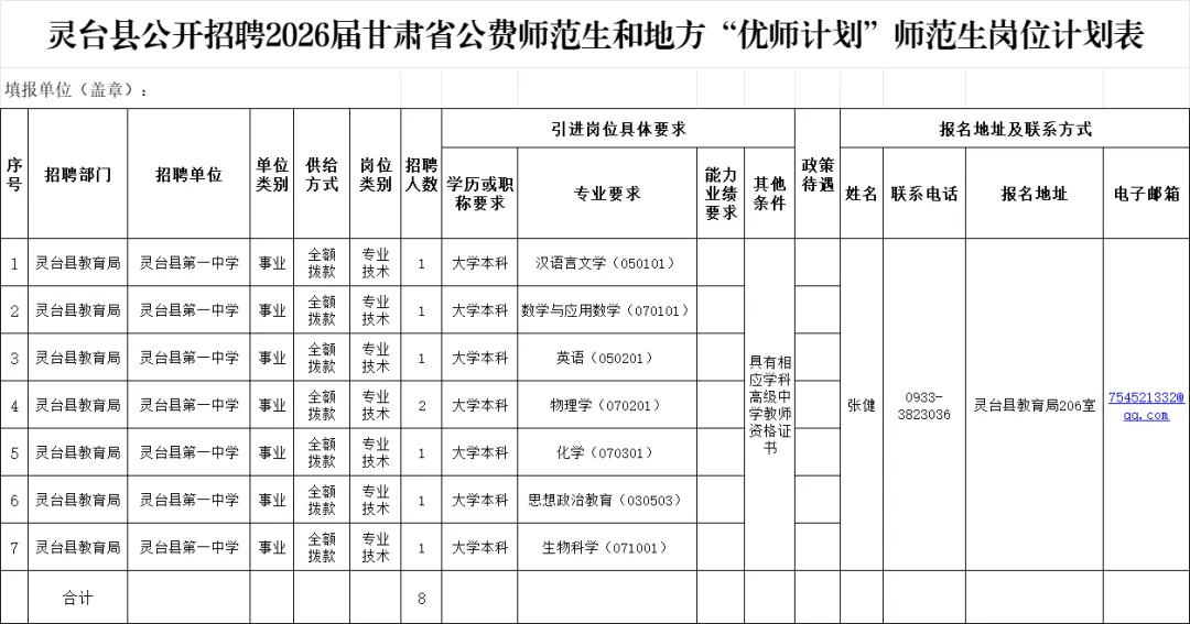 本次计划公开招聘2026届甘肃省公费师范生和地方“优师计划”师范生8名,其中:语文、数学、英语、化学、生物、政治学科各1名,物理学科2名。