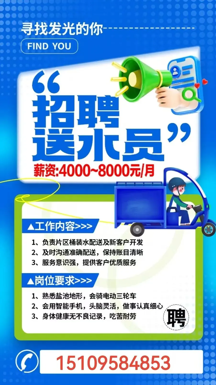 招聘信息:配送员一名,女配货员一名,工资面仪,联系电话13469556299
