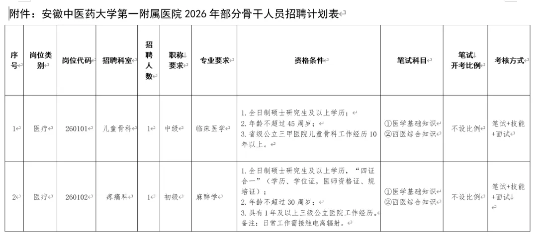 安徽中医药大学第一附属医院2026年部分骨干人员岗位招聘计划表