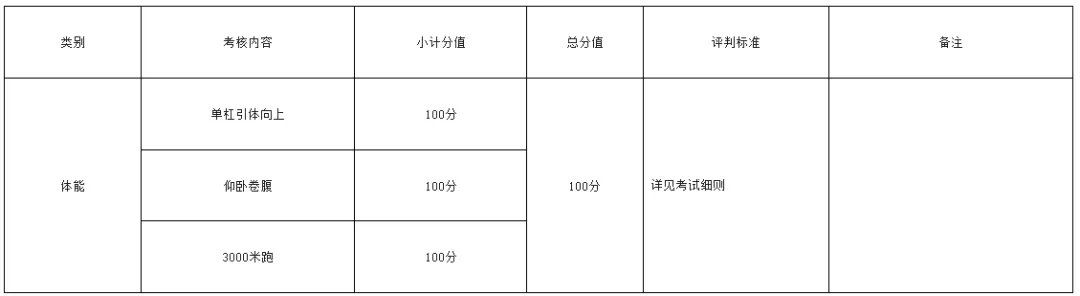 考试项目分为体能、理论基础、面试及示范作业。每个项目总分值为100分,其中体能占比20%、理论基础占比30%、面试及示范作业占比50%。