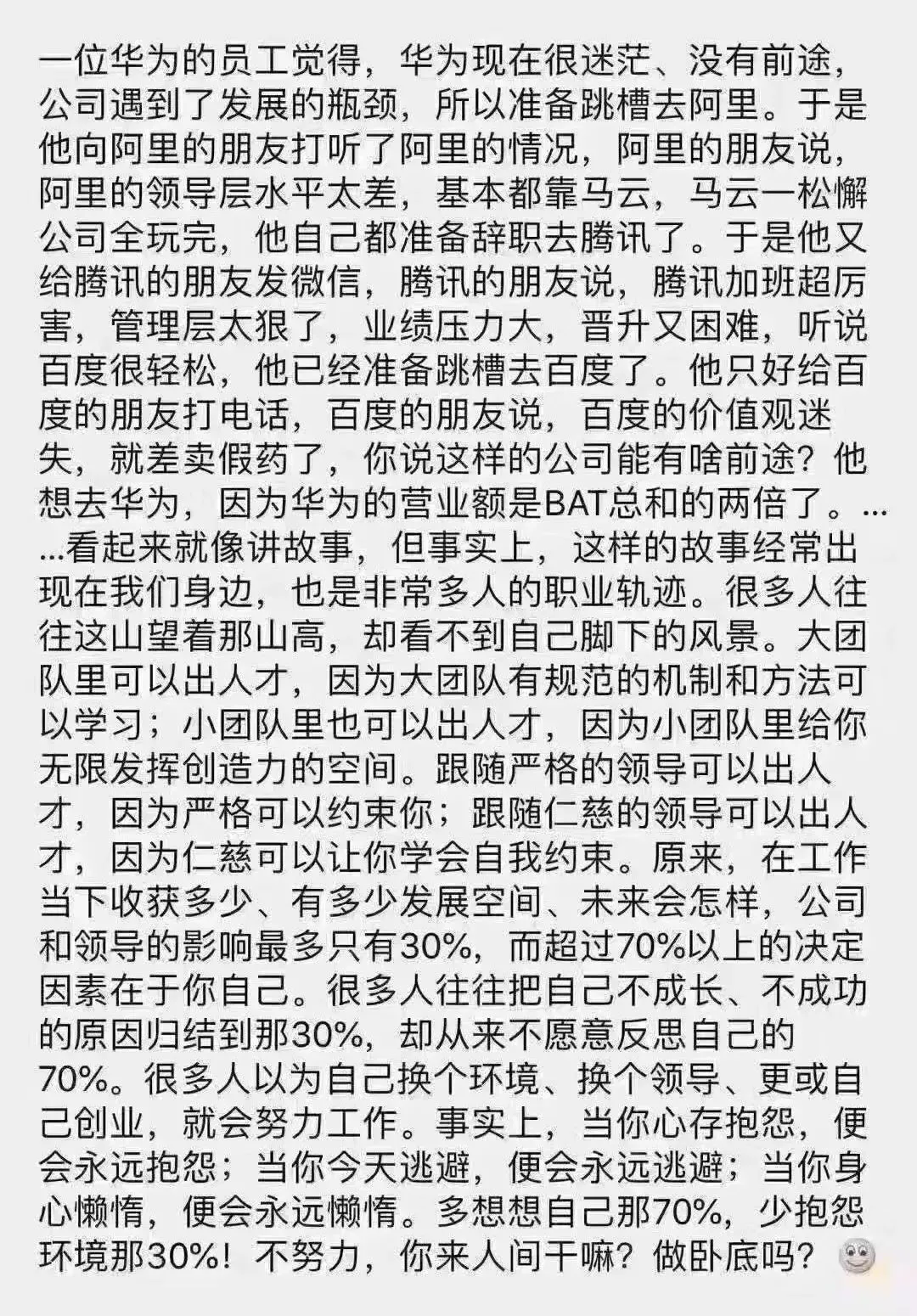 任正非相信的就是努力,各行各业都有成功的人,为什么不能是自己?别在没有成绩之前,标榜自己的不容易,你应该做一个不动声色的大人。生活就是遇山开路,遇水架桥;环境能影响你,但无法决定你。现代的成年人,越来越喜欢把“不想上班”“想辞职”等话挂在嘴边,