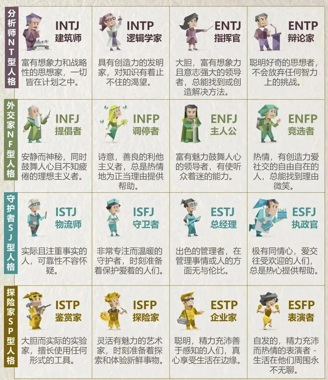 人格分类:16 种类型,分为分析师(NT)、外交家(NF)、守护者(SJ)、探险家(SP)四大类(每类含 4 种具体人格,如 INTJ “建筑师”、ESFJ “执政官” 等);