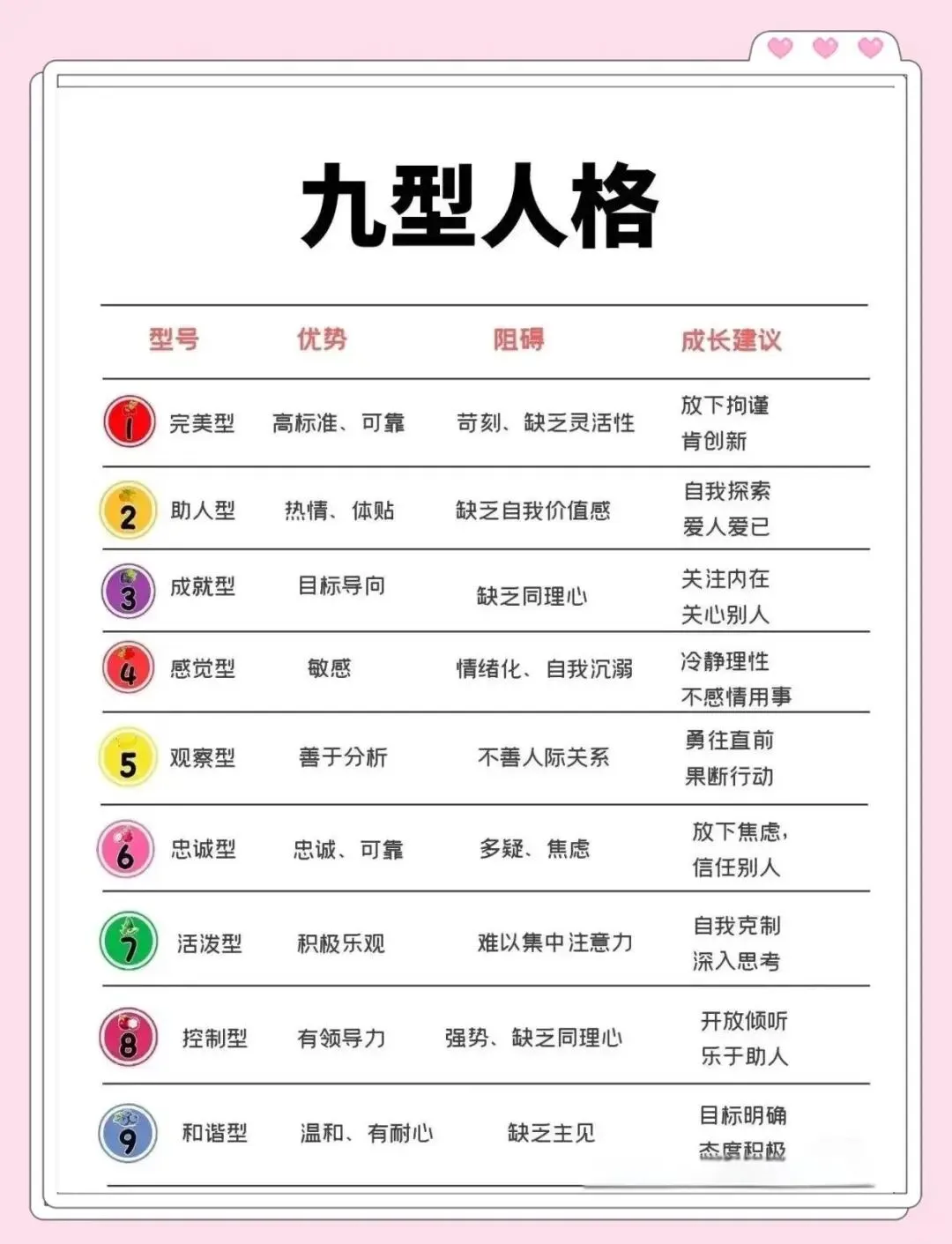 核心分类:将人格划分为完美型、助人型、成就型等九种类型;