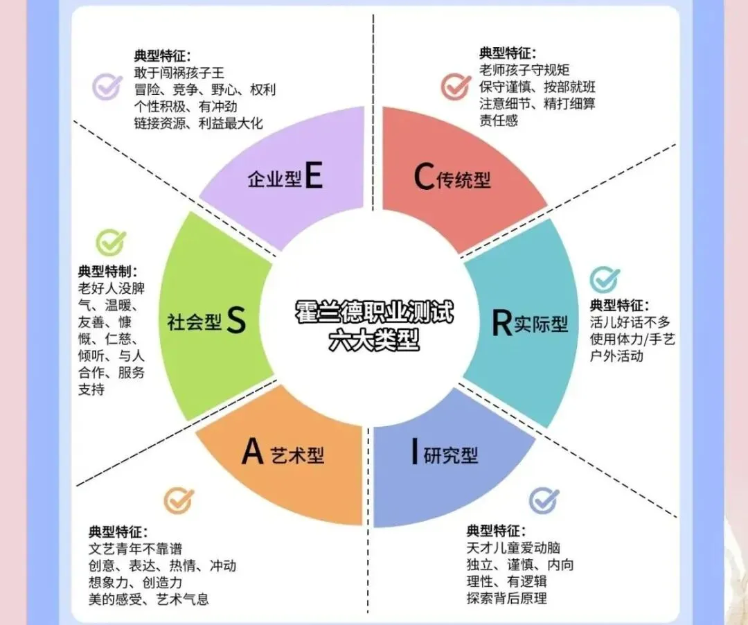 核心分类:将职业兴趣分为现实型、研究型、艺术型、社会型、企业型、常规型六种类型(每种类型对应典型特征,如现实型 “活儿好话不多”、艺术型 “有创意重美感”);