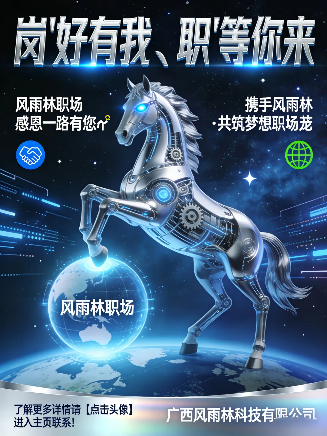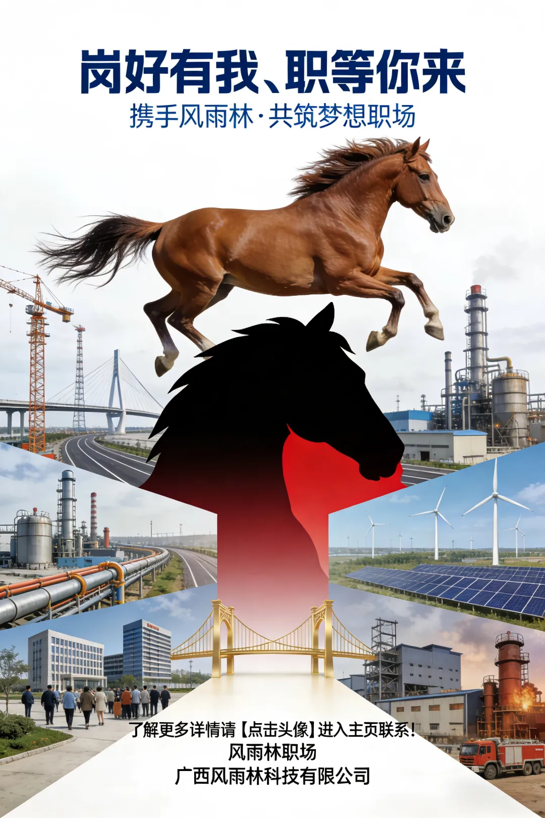 广西风雨林科技有限公司旗下风雨林职场,致力于成为企业与人才的伯乐之桥。我们深耕基础设施建设、石油能源化工、新能源、冶炼制造等关键行业,为企业精准匹配合格英才,高效解决各层级人力资源需求;更化身求职者的千里马助推器,提供专业求职咨询、简历优化、岗位匹配全流程辅导,助你在马年觅得心仪岗位,驰骋职场新赛道!