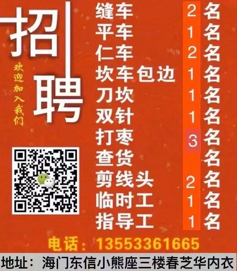 📣📣招聘📣📣本车间专业生产加工:内衣,内裤,吊带裙服装,诚聘各工序车工:急需岗位:打枣工,大仁车,勾扣,缝车密缝,熟手坎车,剪线头成品,剪线手工,车间指导工。☎️13553361665地址:海门东信小熊座三楼春芝华内衣